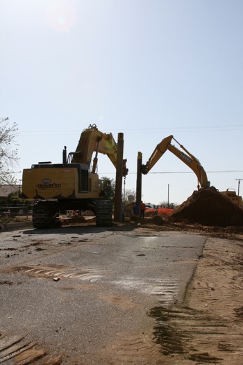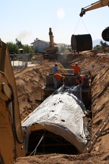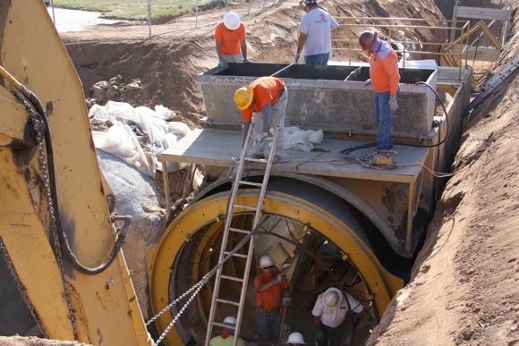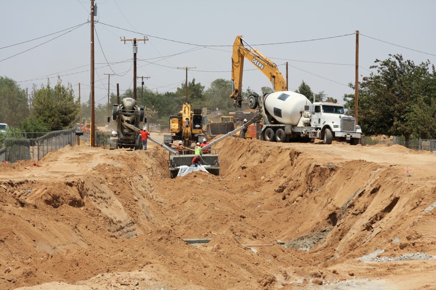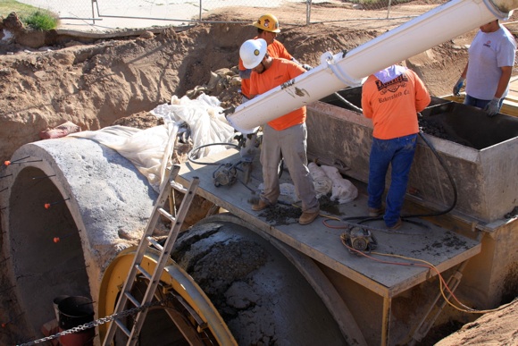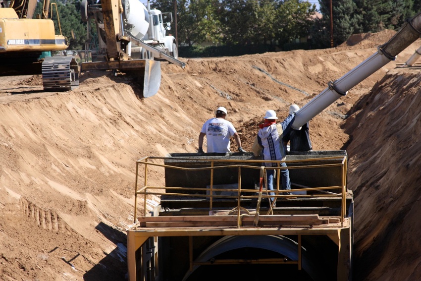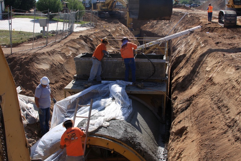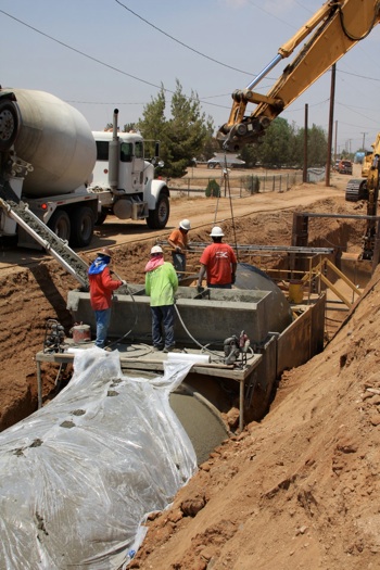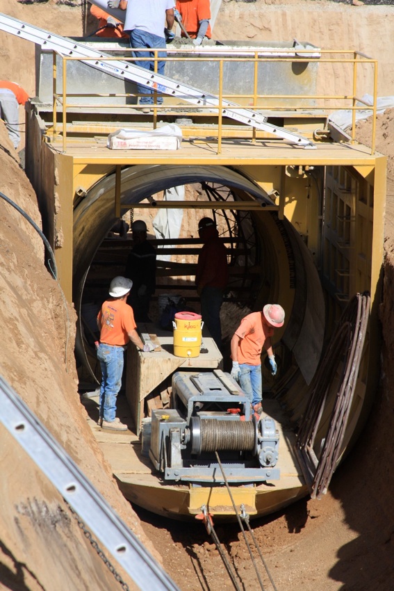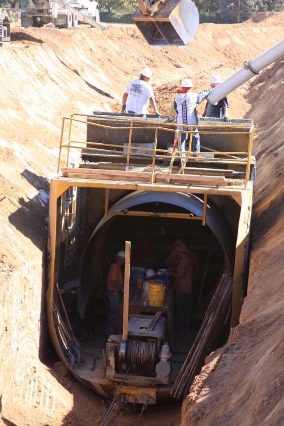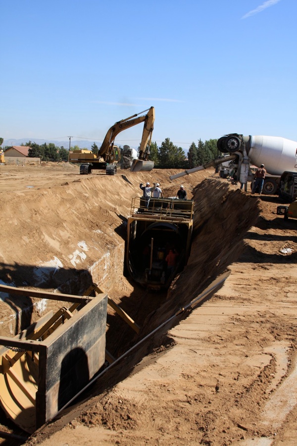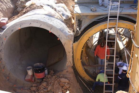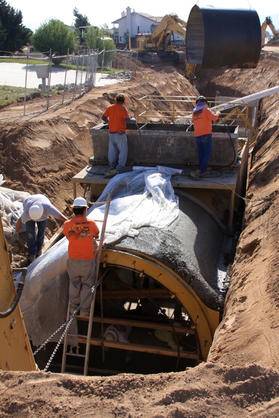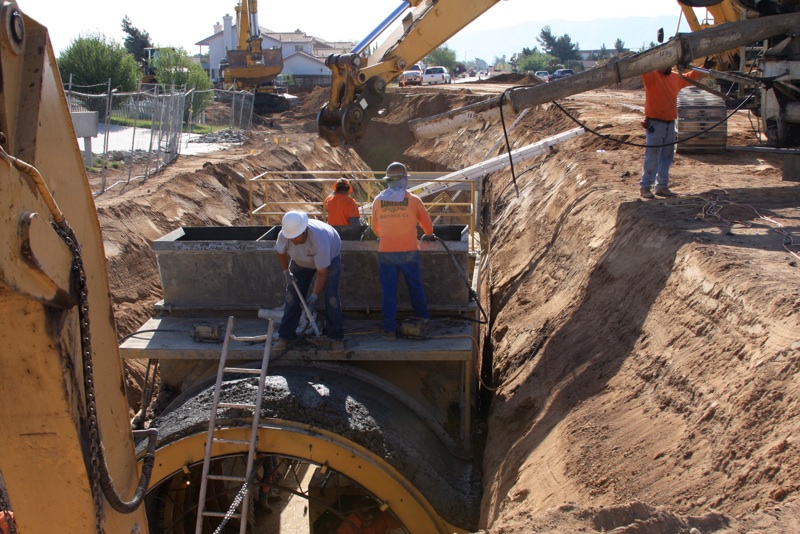 This project was under contract with Floyd Johnston Construction and the City of Hesperia. While working for Floyd Johnston Construction, Mr. Francisco Curiel was the project manager and oversaw the daily operations. This project consisted of the installation of double barrel 120” Cast-In-Place Concrete Pipe, 120” double barrel Reinforced Concrete Pipe, 24” Reinforced Concrete Pipe used for lateral connections, drain inlets, relocation of main water lines and sewer lines. The cast in place machine shown below was actually designed by Mr. Floyd Johnston himself and was built at the Floyd Johnston Constructions shop. This 120” cast-in-place machine is the only machine in existence world wide.